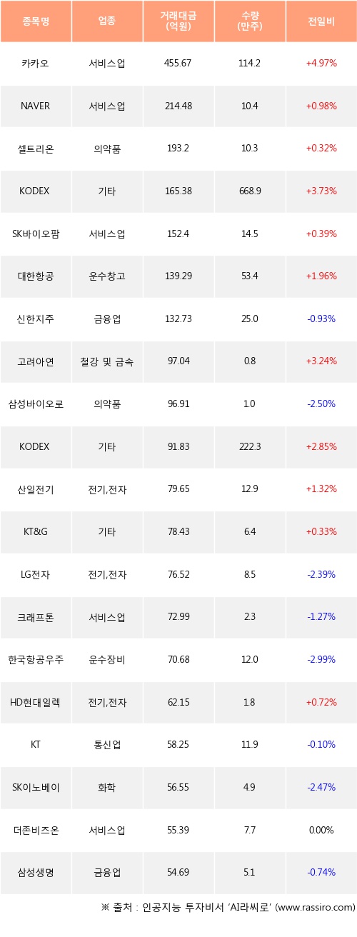 카카오, NAVER, 셀트리온 등은 전일 대비 주가가 상승했고, 신한지주, 삼성바이오로직스, LG전자 등은 주가가 하락했다.