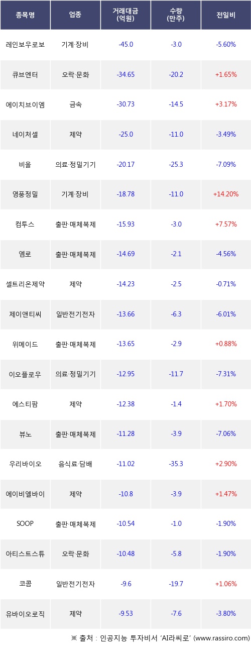 외국인 투자자의 순매도 상위 20개 종목은 레인보우로보틱스, 큐브엔터, 에이치브이엠, 네이처셀, 비올, 영풍정밀, 컴투스, 엠로, 셀트리온제약, 제이앤티씨등이다.