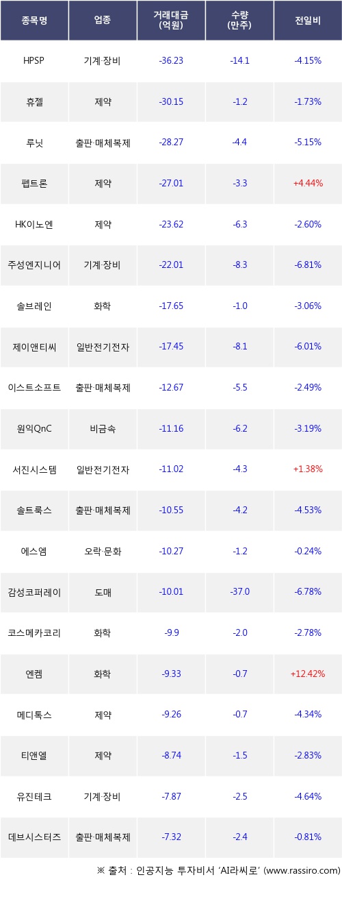 기관 투자자의 순매도 상위 20개 종목은 HPSP, 휴젤, 루닛, 펩트론, HK이노엔, 주성엔지니어링, 솔브레인, 제이앤티씨, 이스트소프트, 원익QnC등이다.