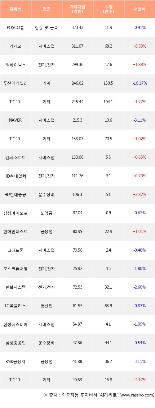 카카오, SK하이닉스, TIGER 미국테크TOP10 INDXX 등은 전일 대비 주가가 상승했고, POSCO홀딩스, 두산에너빌리티, NAVER 등은 주가가 하락했다.