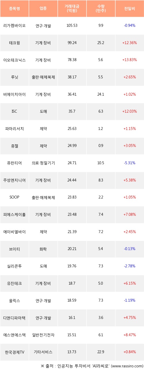 기관 투자자의 순매수 상위 20개 종목은 리가켐바이오, 테크윙, 이오테크닉스, 루닛, 비에이치아이, ISC, 파마리서치, 휴젤, 퓨런티어, 주성엔지니어링등이다.