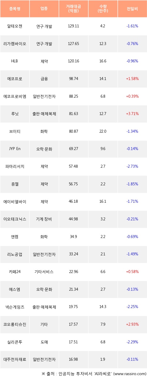 에코프로, 에코프로비엠, 루닛 등은 전일 대비 주가가 상승했고, 알테오젠, 리가켐바이오, HLB 등은 주가가 하락했다.