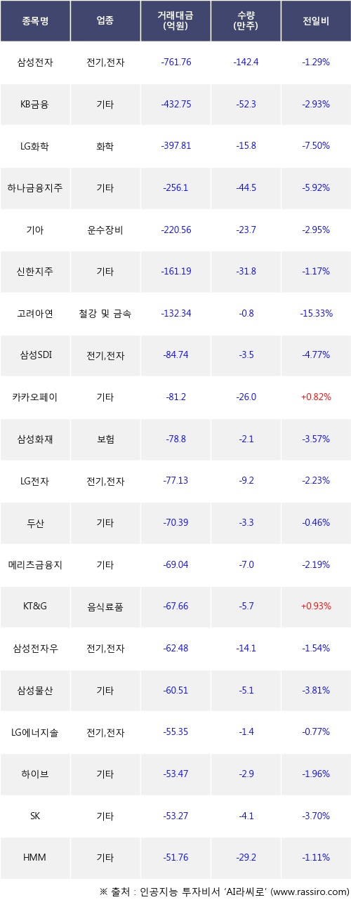 외국인 투자자의 순매도 상위 20개 종목은 삼성전자, KB금융, LG화학, 하나금융지주, 기아, 신한지주, 고려아연, 삼성SDI, 카카오페이, 삼성화재등이다.