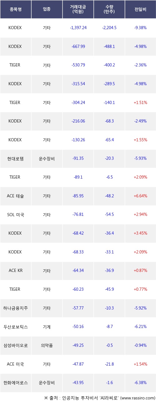 기관 투자자의 순매도 상위 20개 종목은 KODEX 코스닥150레버리지, KODEX 레버리지, TIGER MSCI Korea TR, KODEX 코스닥150, TIGER 미국S&P500, KODEX 200, KODEX 미국S&P500TR, 현대로템, TIGER 미국나스닥100, ACE 테슬라밸류체인액티브등이다.