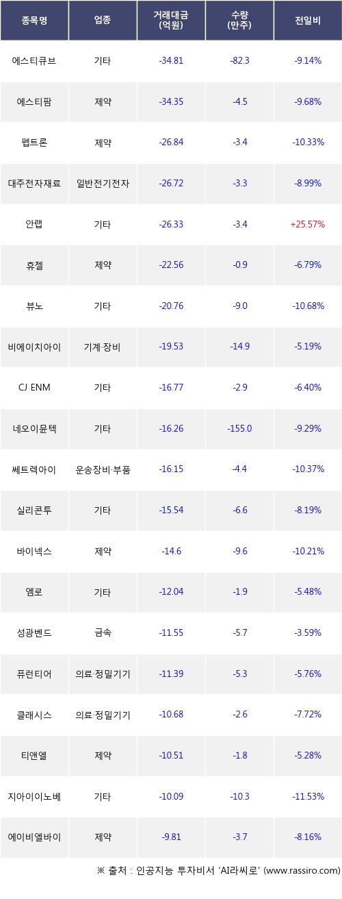 기관 투자자의 순매도 상위 20개 종목은 에스티큐브, 에스티팜, 펩트론, 대주전자재료, 안랩, 휴젤, 뷰노, 비에이치아이, CJ ENM, 네오이뮨텍등이다.
