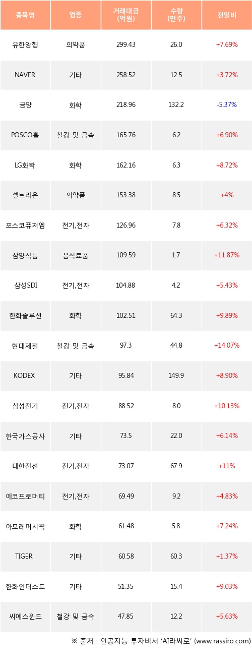 유한양행, NAVER, POSCO홀딩스 등은 전일 대비 주가가 상승했고, 금양 등은 주가가 하락했다.