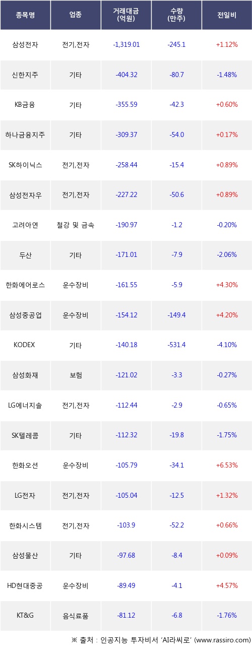 외국인 투자자의 순매도 상위 20개 종목은 삼성전자, 신한지주, KB금융, 하나금융지주, SK하이닉스, 삼성전자우, 고려아연, 두산, 한화에어로스페이스, 삼성중공업등이다.