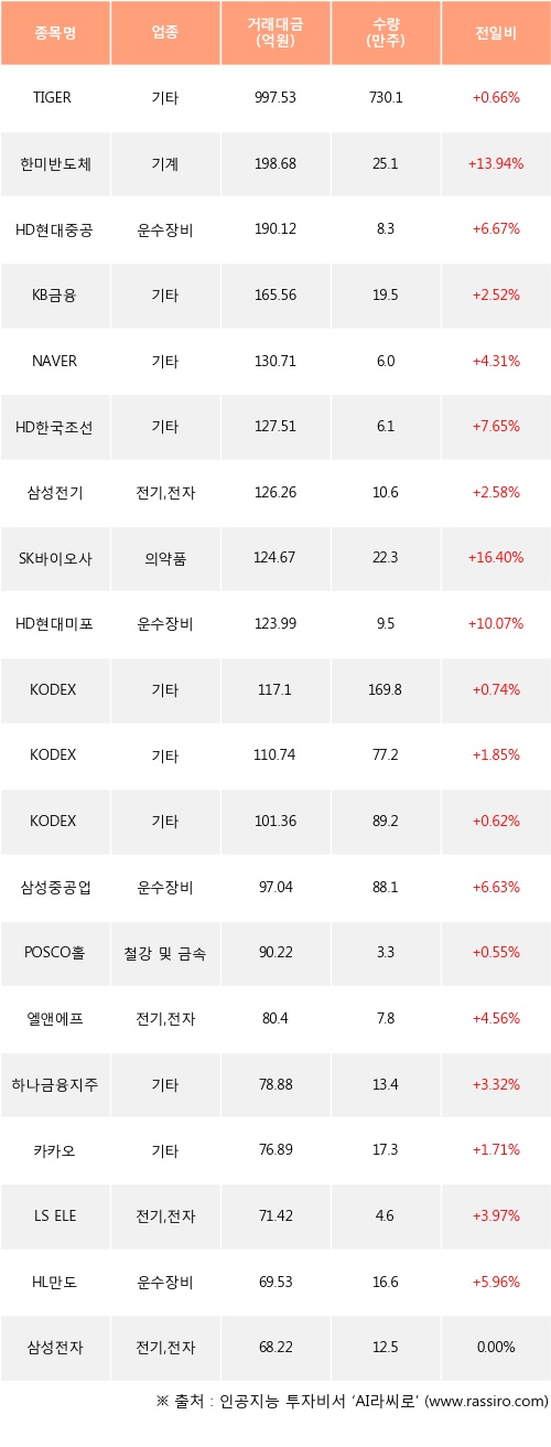 기관 투자자의 순매수 상위 20개 종목은 TIGER MSCI Korea TR, 한미반도체, HD현대중공업, KB금융, NAVER, HD한국조선해양, 삼성전기, SK바이오사이언스, HD현대미포, KODEX 코스닥150레버리지등이다.