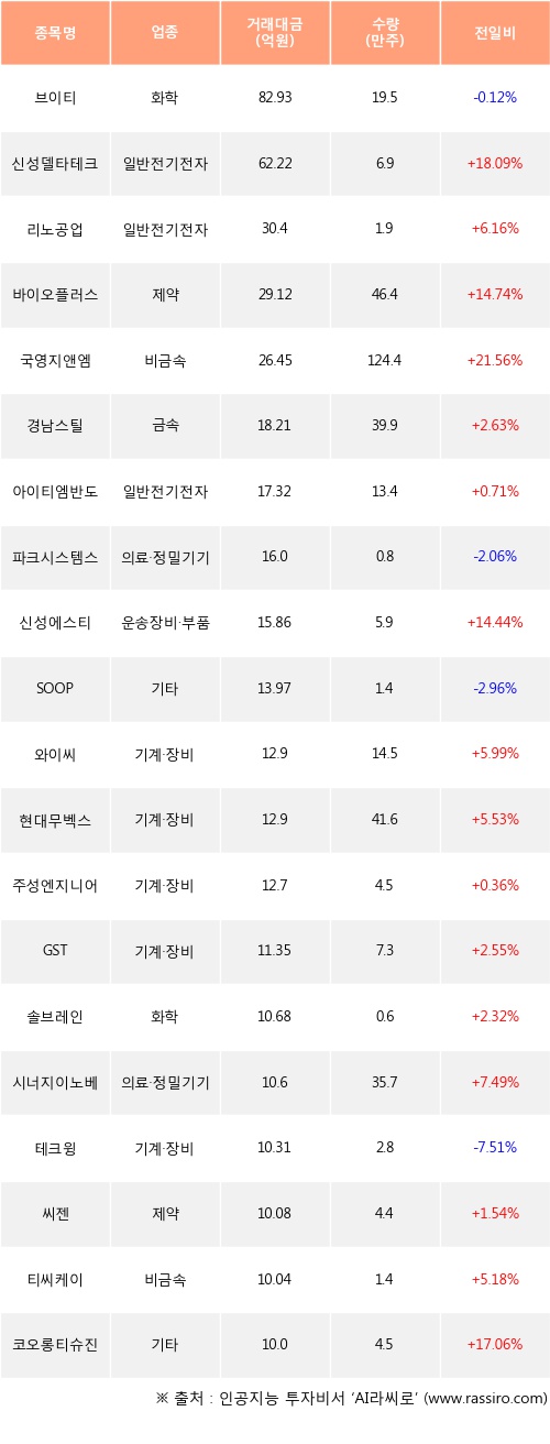 신성델타테크, 리노공업, 바이오플러스 등은 전일 대비 주가가 상승했고, 브이티, 파크시스템스, SOOP 등은 주가가 하락했다.