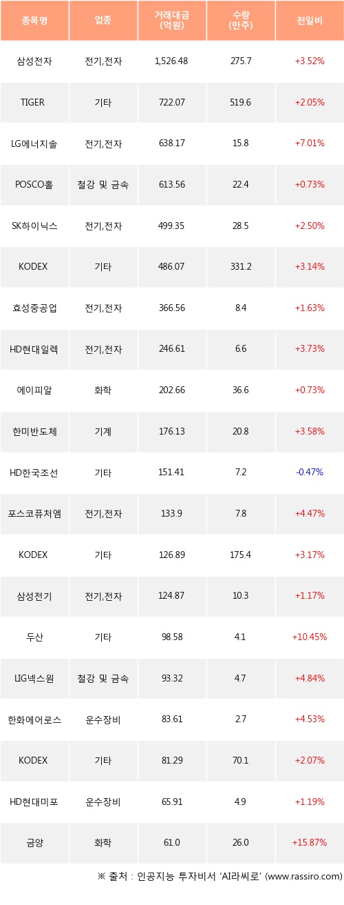 삼성전자, TIGER MSCI Korea TR, LG에너지솔루션 등은 전일 대비 주가가 상승했고, HD한국조선해양 등은 주가가 하락했다.