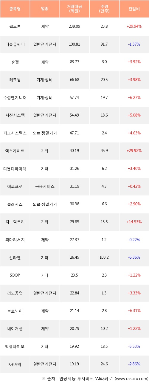 펩트론, 휴젤, 테크윙 등은 전일 대비 주가가 상승했고, 더블유씨피, 파마리서치, 신라젠 등은 주가가 하락했다.