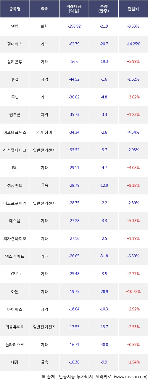 외국인 투자자의 순매도 상위 20개 종목은 엔켐, 펄어비스, 실리콘투, 휴젤, 루닛, 펩트론, 이오테크닉스, 신성델타테크, ISC, 성광벤드등이다.
