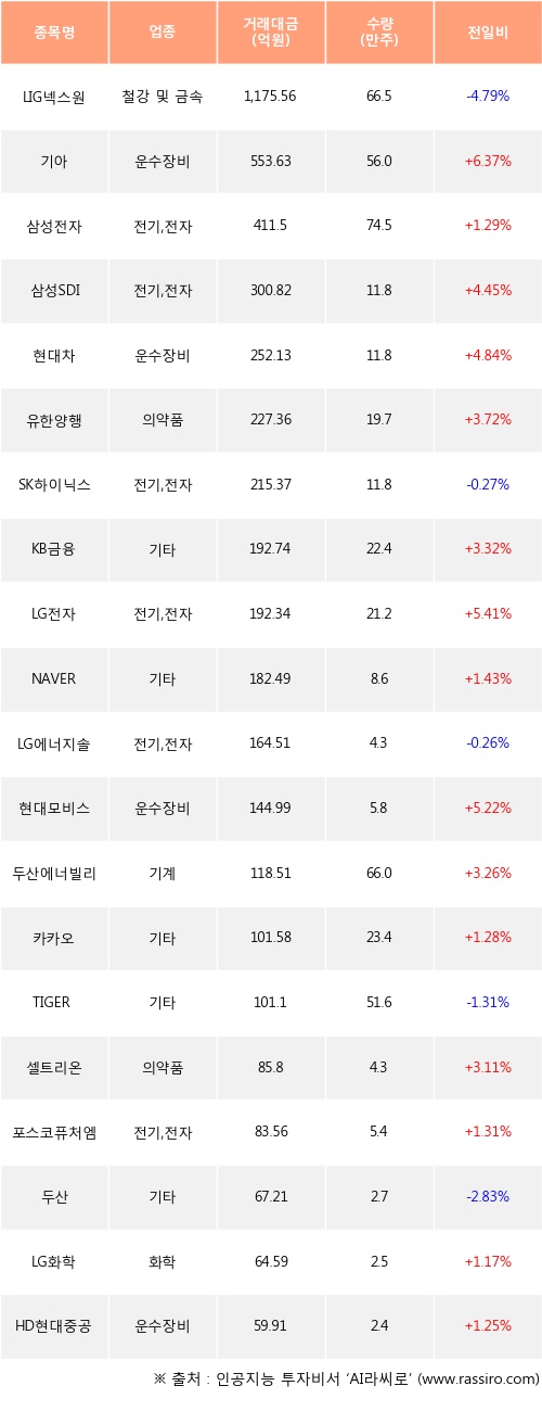 외국인 투자자의 순매수 상위 20개 종목은 LIG넥스원, 기아, 삼성전자, 삼성SDI, 현대차, 유한양행, SK하이닉스, KB금융, LG전자, NAVER등이다.