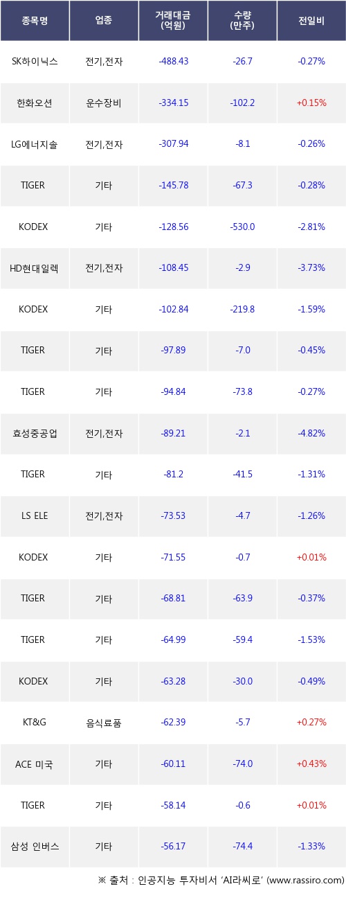 기관 투자자의 순매도 상위 20개 종목은 SK하이닉스, 한화오션, LG에너지솔루션, TIGER 미국S&P500, KODEX 200선물인버스2X, HD현대일렉트릭, KODEX 인버스, TIGER 미국나스닥100, TIGER 미국배당다우존스, 효성중공업등이다.
