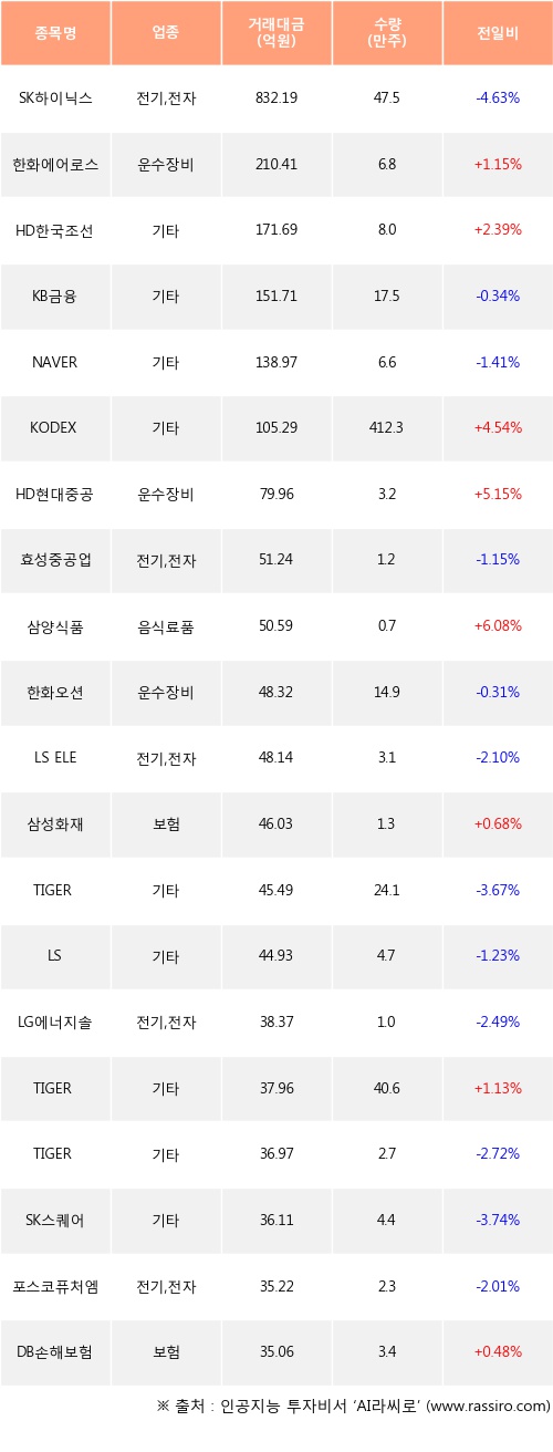 한화에어로스페이스, HD한국조선해양, KODEX 200선물인버스2X 등은 전일 대비 주가가 상승했고, SK하이닉스, KB금융, NAVER 등은 주가가 하락했다.