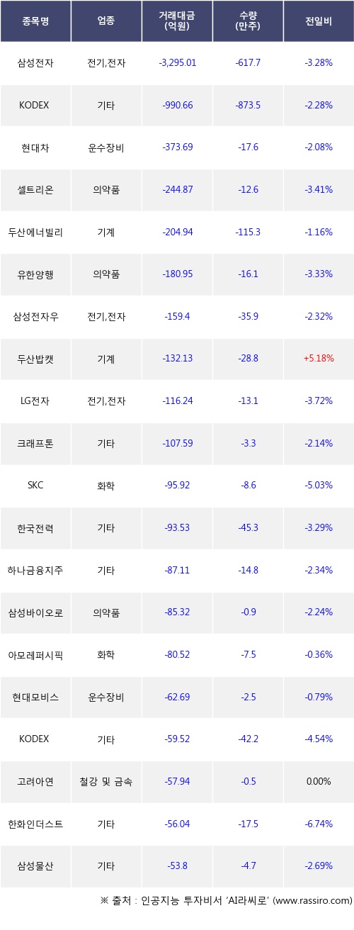 외국인 투자자의 순매도 상위 20개 종목은 삼성전자, KODEX 200TR, 현대차, 셀트리온, 두산에너빌리티, 유한양행, 삼성전자우, 두산밥캣, LG전자, 크래프톤등이다.