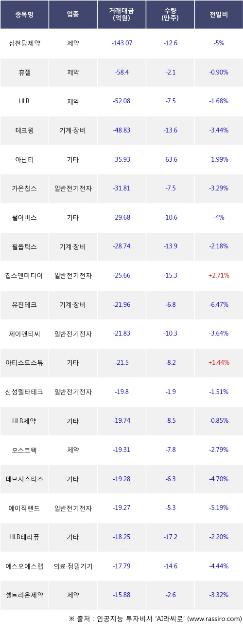 외국인 투자자의 순매도 상위 20개 종목은 삼천당제약, 휴젤, HLB, 테크윙, 아난티, 가온칩스, 펄어비스, 필옵틱스, 칩스앤미디어, 유진테크등이다.