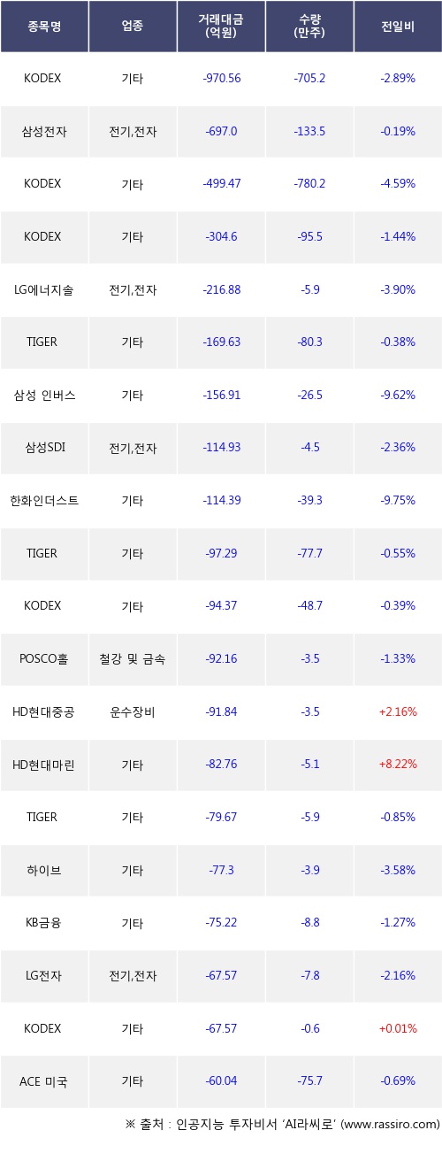 기관 투자자의 순매도 상위 20개 종목은 KODEX 레버리지, 삼성전자, KODEX 코스닥150레버리지, KODEX 200, LG에너지솔루션, TIGER 미국S&P500, 삼성 인버스 2X 천연가스 선물 ETN C, 삼성SDI, 한화인더스트리얼솔루션즈, TIGER 미국배당다우존스등이다.