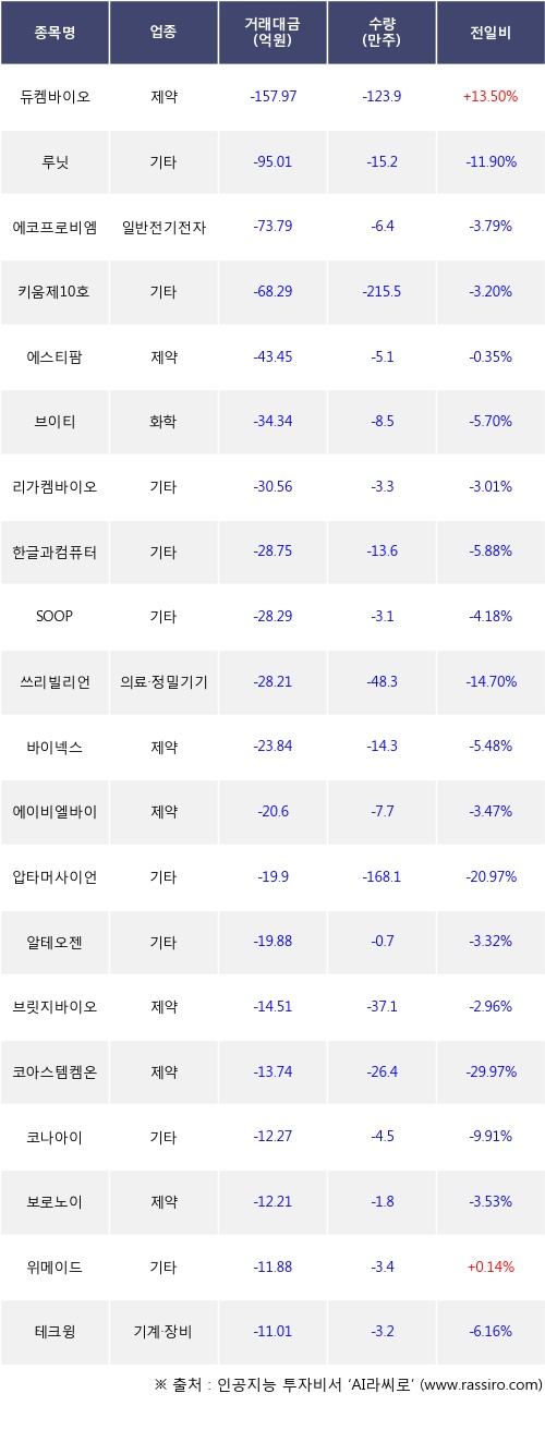 기관 투자자의 순매도 상위 20개 종목은 듀켐바이오, 루닛, 에코프로비엠, 키움제10호스팩, 에스티팜, 브이티, 리가켐바이오, 한글과컴퓨터, SOOP, 쓰리빌리언등이다.