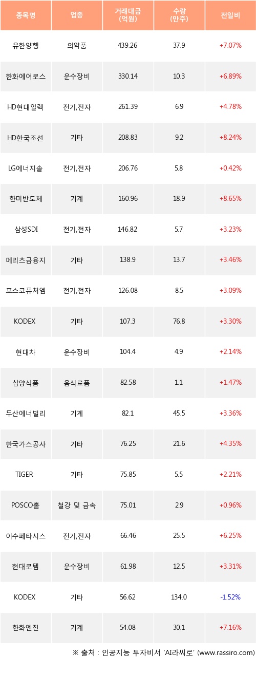 외국인 투자자의 순매수 상위 20개 종목은 유한양행, 한화에어로스페이스, HD현대일렉트릭, HD한국조선해양, LG에너지솔루션, 한미반도체, 삼성SDI, 메리츠금융지주, 포스코퓨처엠, KODEX 레버리지등이다.