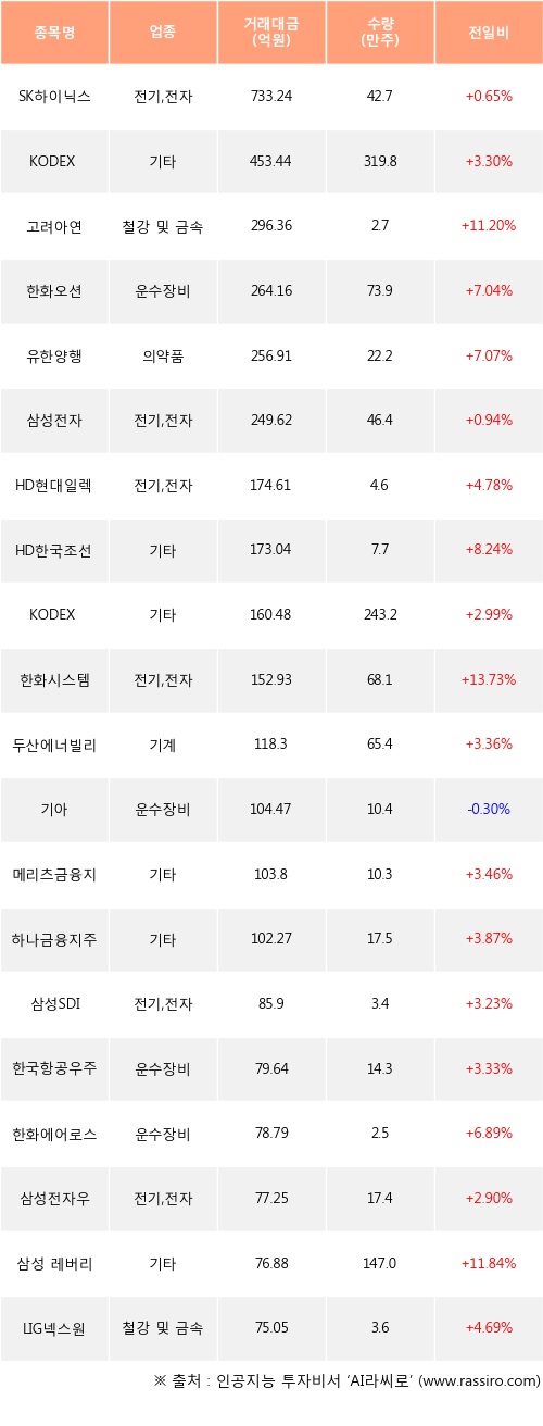 SK하이닉스, KODEX 레버리지, 고려아연 등은 전일 대비 주가가 상승했고, 기아 등은 주가가 하락했다.