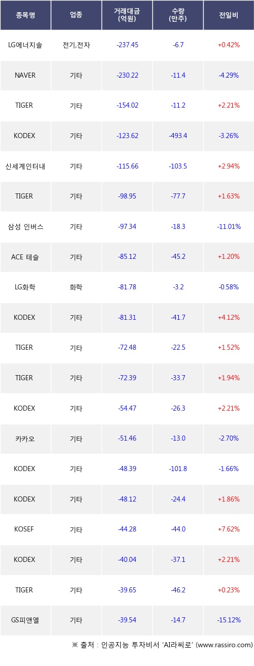 LG에너지솔루션, TIGER 미국나스닥100, 신세계인터내셔날 등은 전일 대비 주가가 상승했고, NAVER, KODEX 200선물인버스2X, 삼성 인버스 2X 천연가스 선물 ETN C 등은 주가가 하락했다.