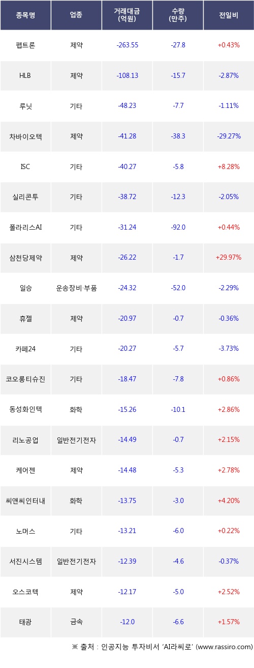 외국인 투자자의 순매도 상위 20개 종목은 펩트론, HLB, 루닛, 차바이오텍, ISC, 실리콘투, 폴라리스AI, 삼천당제약, 일승, 휴젤등이다.