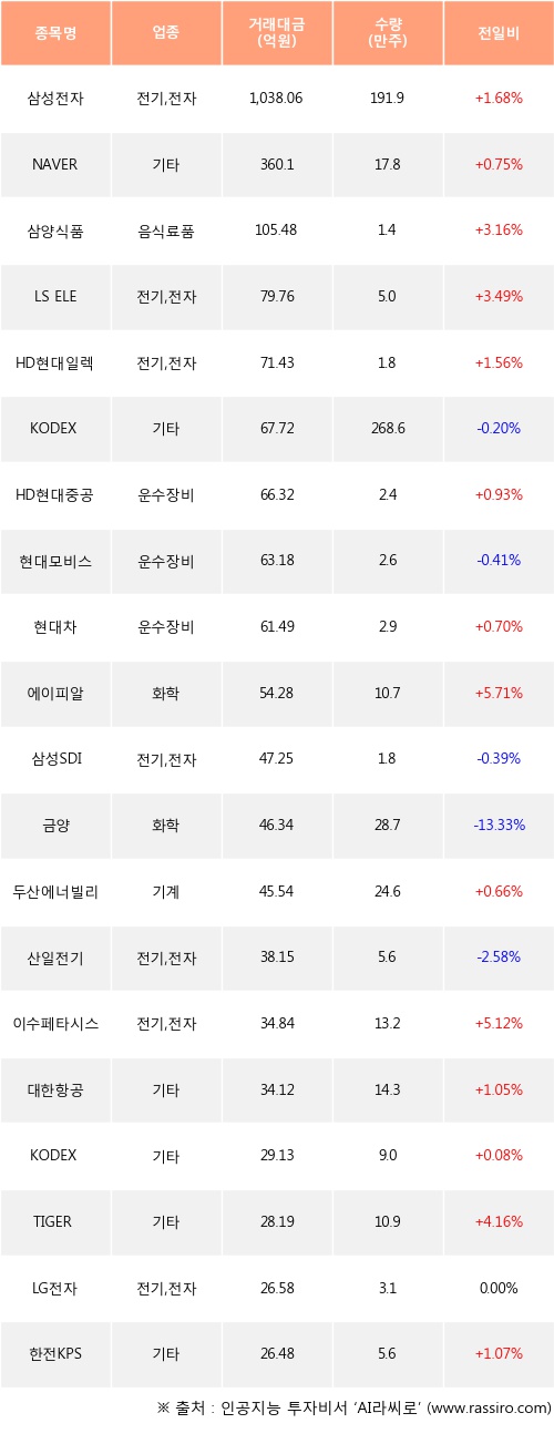 삼성전자, NAVER, 삼양식품 등은 전일 대비 주가가 상승했고, KODEX 200선물인버스2X, 현대모비스, 삼성SDI 등은 주가가 하락했다.