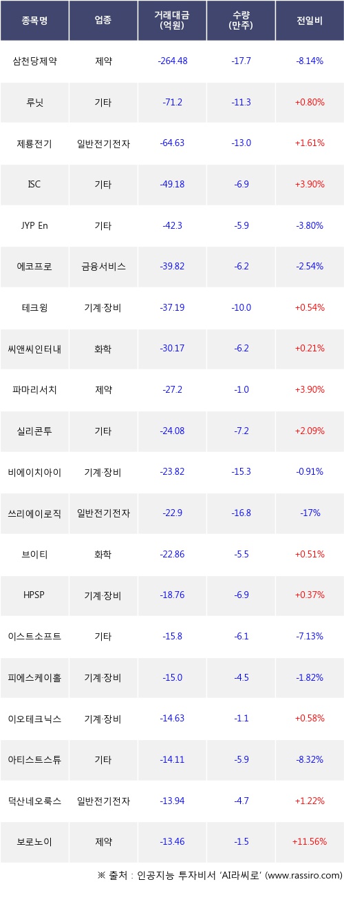 외국인 투자자의 순매도 상위 20개 종목은 삼천당제약, 루닛, 제룡전기, ISC, JYP Ent., 에코프로, 테크윙, 씨앤씨인터내셔널, 파마리서치, 실리콘투등이다.