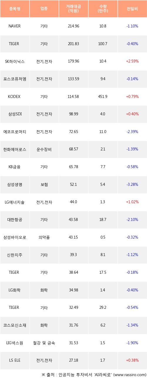 SK하이닉스, KODEX 200선물인버스2X, 삼성SDI 등은 전일 대비 주가가 상승했고, NAVER, TIGER 미국필라델피아반도체나스닥, 포스코퓨처엠 등은 주가가 하락했다.