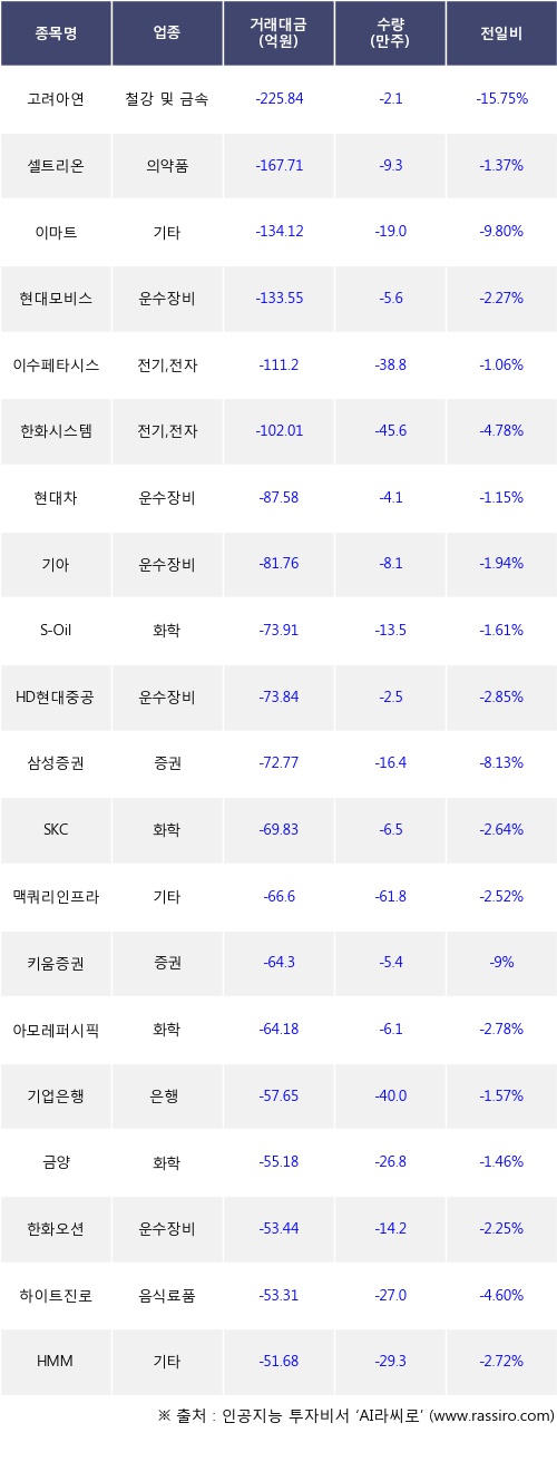 외국인 투자자의 순매도 상위 20개 종목은 고려아연, 셀트리온, 이마트, 현대모비스, 이수페타시스, 한화시스템, 현대차, 기아, S-Oil, HD현대중공업등이다.