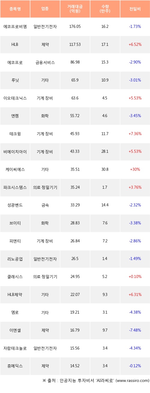 HLB, 이오테크닉스, 테크윙 등은 전일 대비 주가가 상승했고, 에코프로비엠, 에코프로, 루닛 등은 주가가 하락했다.