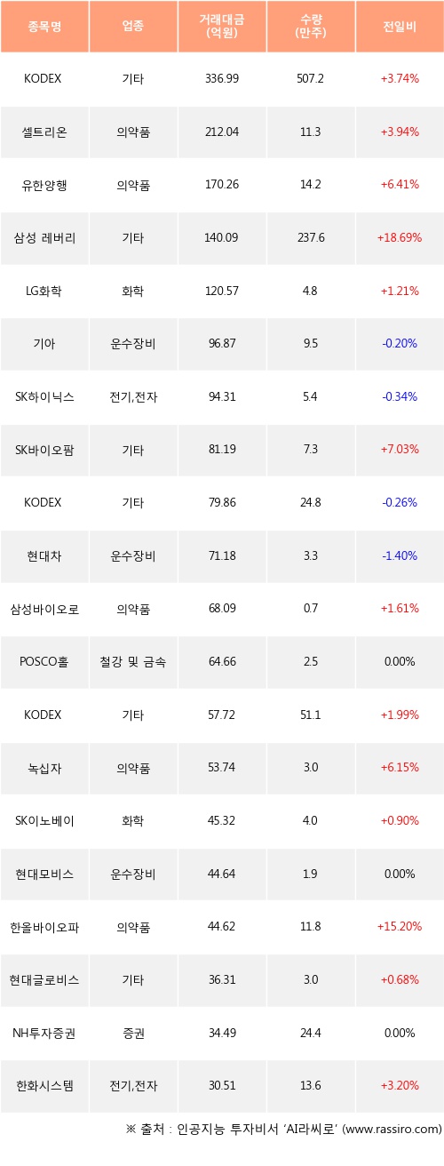 KODEX 코스닥150레버리지, 셀트리온, 유한양행 등은 전일 대비 주가가 상승했고, 기아, SK하이닉스, KODEX 200 등은 주가가 하락했다.