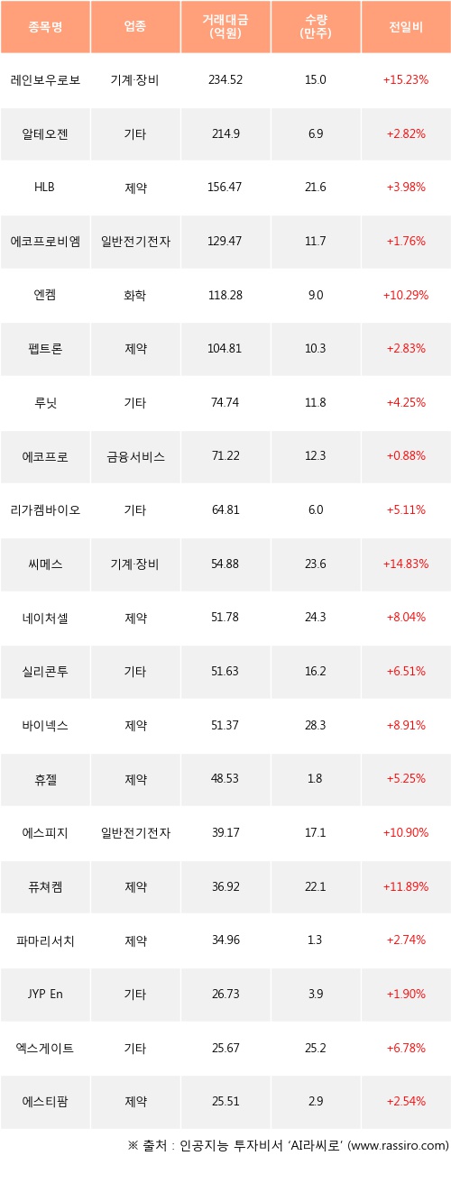 외국인 투자자의 순매수 상위 20개 종목은 레인보우로보틱스, 알테오젠, HLB, 에코프로비엠, 엔켐, 펩트론, 루닛, 에코프로, 리가켐바이오, 씨메스등이다.