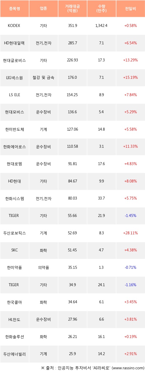 기관 투자자의 순매수 상위 20개 종목은 KODEX 200선물인버스2X, HD현대일렉트릭, 현대글로비스, LIG넥스원, LS ELECTRIC, 현대모비스, 한미반도체, 한화에어로스페이스, 현대로템, HD현대등이다.