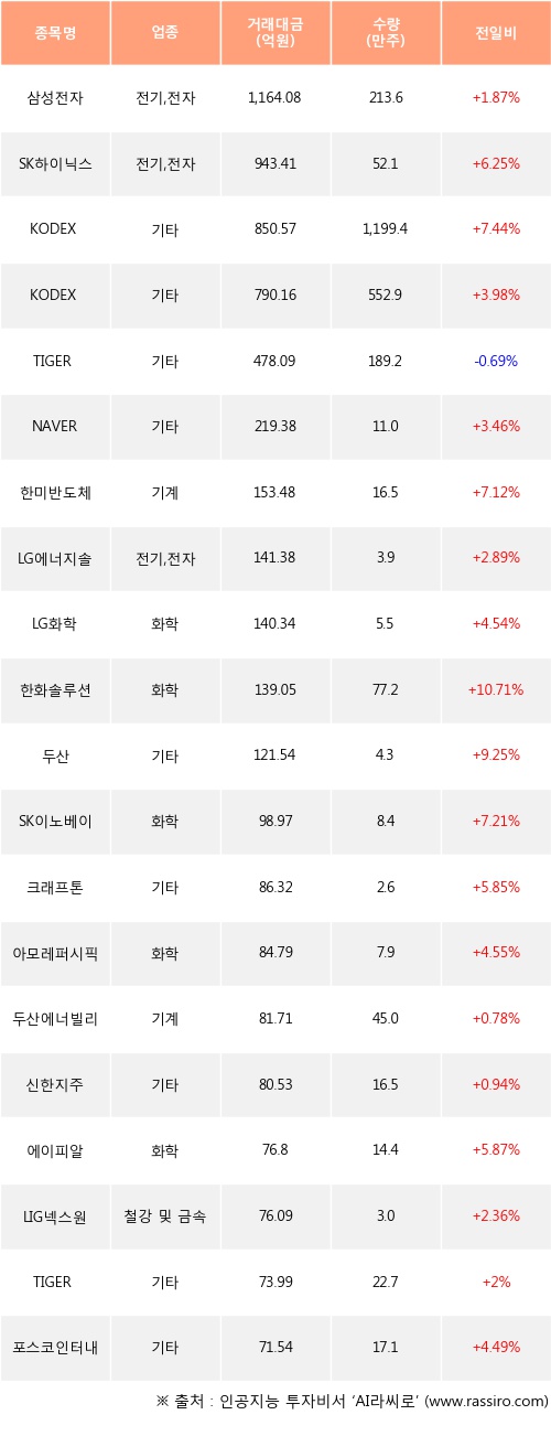 삼성전자, SK하이닉스, KODEX 코스닥150레버리지 등은 전일 대비 주가가 상승했고, TIGER 미국테크TOP10 INDXX 등은 주가가 하락했다.