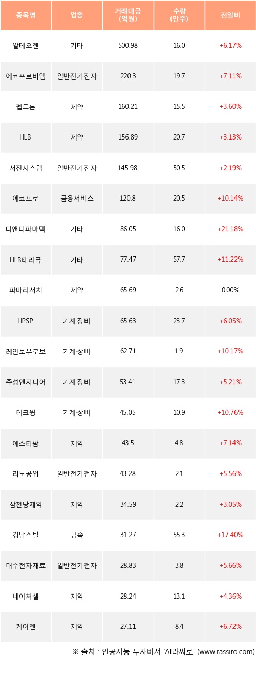 외국인 투자자의 순매수 상위 20개 종목은 알테오젠, 에코프로비엠, 펩트론, HLB, 서진시스템, 에코프로, 디앤디파마텍, HLB테라퓨틱스, 파마리서치, HPSP등이다.