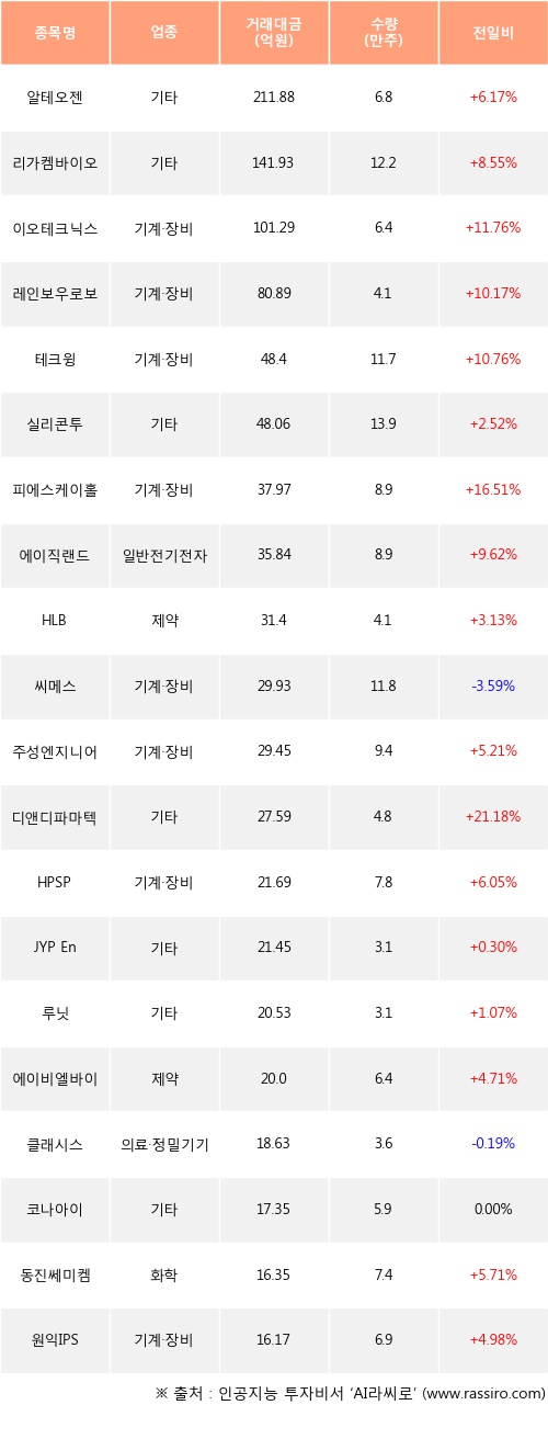기관 투자자의 순매수 상위 20개 종목은 알테오젠, 리가켐바이오, 이오테크닉스, 레인보우로보틱스, 테크윙, 실리콘투, 피에스케이홀딩스, 에이직랜드, HLB, 씨메스등이다.