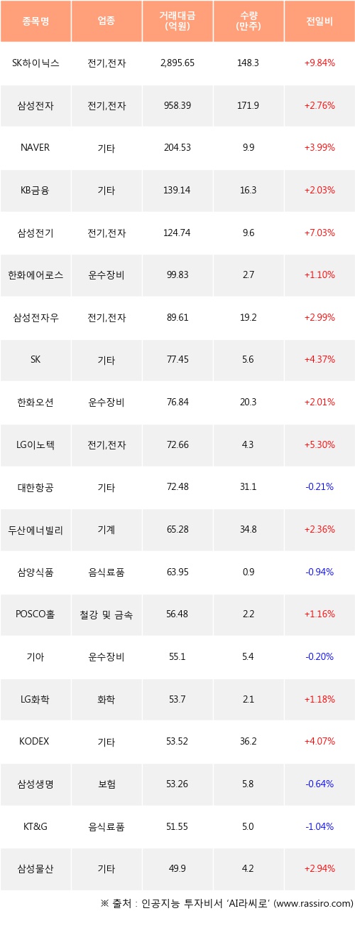 외국인 투자자의 순매수 상위 20개 종목은 SK하이닉스, 삼성전자, NAVER, KB금융, 삼성전기, 한화에어로스페이스, 삼성전자우, SK, 한화오션, LG이노텍등이다.