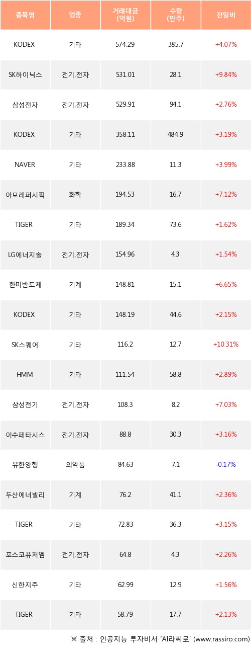 KODEX 레버리지, SK하이닉스, 삼성전자 등은 전일 대비 주가가 상승했고, 유한양행 등은 주가가 하락했다.