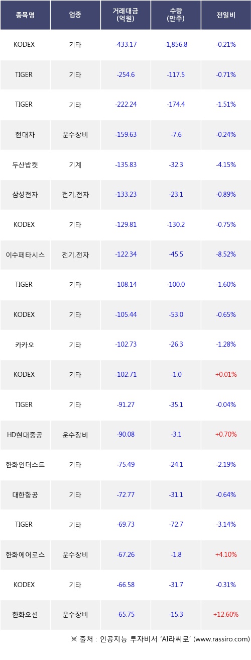 기관 투자자의 순매도 상위 20개 종목은 KODEX 200선물인버스2X, TIGER 미국S&P500, TIGER 미국배당다우존스, 현대차, 두산밥캣, 삼성전자, KODEX 미국S&P500데일리커버드콜OTM, 이수페타시스, TIGER 미국배당다우존스타겟커버드콜2호, KODEX 미국S&P500TR등이다.
