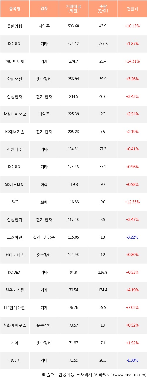 유한양행, KODEX 레버리지, 한미반도체 등은 전일 대비 주가가 상승했고, 고려아연, TIGER 미국테크TOP10 INDXX 등은 주가가 하락했다.