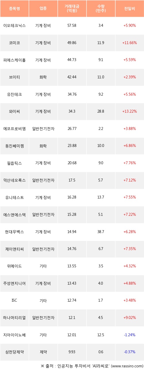 기관 투자자의 순매수 상위 20개 종목은 이오테크닉스, 코미코, 피에스케이홀딩스, 브이티, 유진테크, 와이씨, 에코프로비엠, 동진쎄미켐, 필옵틱스, 덕산네오룩스등이다.