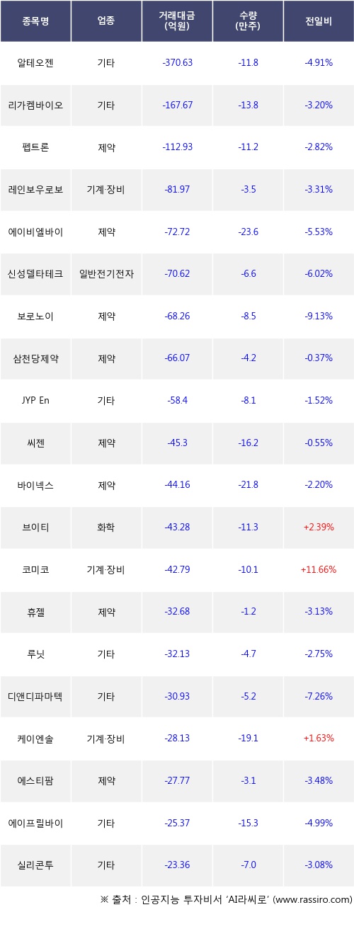 외국인 투자자의 순매도 상위 20개 종목은 알테오젠, 리가켐바이오, 펩트론, 레인보우로보틱스, 에이비엘바이오, 신성델타테크, 보로노이, 삼천당제약, JYP Ent., 씨젠등이다.