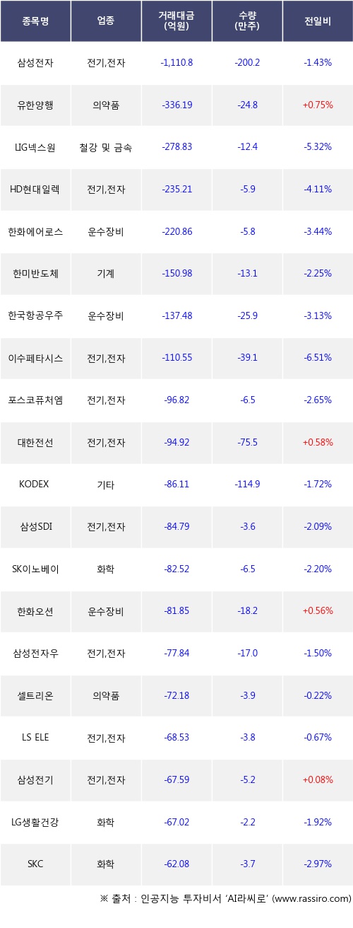 외국인 투자자의 순매도 상위 20개 종목은 삼성전자, 유한양행, LIG넥스원, HD현대일렉트릭, 한화에어로스페이스, 한미반도체, 한국항공우주, 이수페타시스, 포스코퓨처엠, 대한전선등이다.