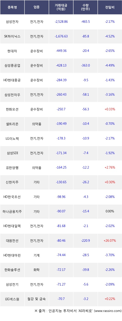외국인 투자자의 순매도 상위 20개 종목은 삼성전자, SK하이닉스, 현대차, 삼성중공업, HD현대중공업, 삼성전자우, 한화오션, 셀트리온, LG이노텍, 삼성SDI등이다.