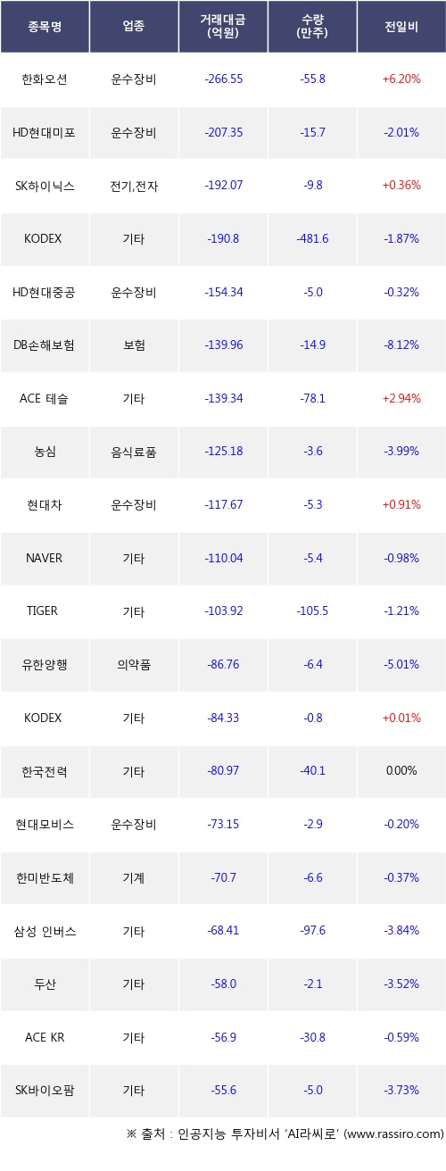 기관 투자자의 순매도 상위 20개 종목은 한화오션, HD현대미포, SK하이닉스, KODEX 코스닥150선물인버스, HD현대중공업, DB손해보험, ACE 테슬라밸류체인액티브, 농심, 현대차, NAVER등이다.