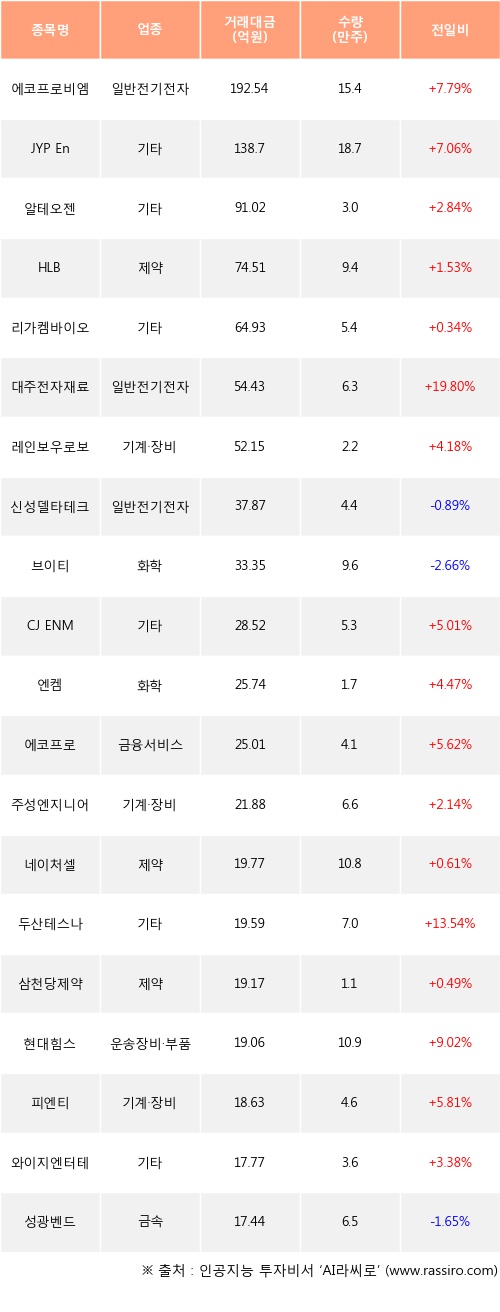 에코프로비엠, JYP Ent., 알테오젠 등은 전일 대비 주가가 상승했고, 신성델타테크, 브이티, 성광벤드 등은 주가가 하락했다.