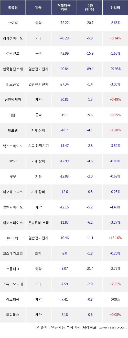 기관 투자자의 순매도 상위 20개 종목은 브이티, 리가켐바이오, 성광벤드, 한국첨단소재, 리노공업, 삼천당제약, 태광, 테크윙, 넥스트바이오메디컬, HPSP등이다.