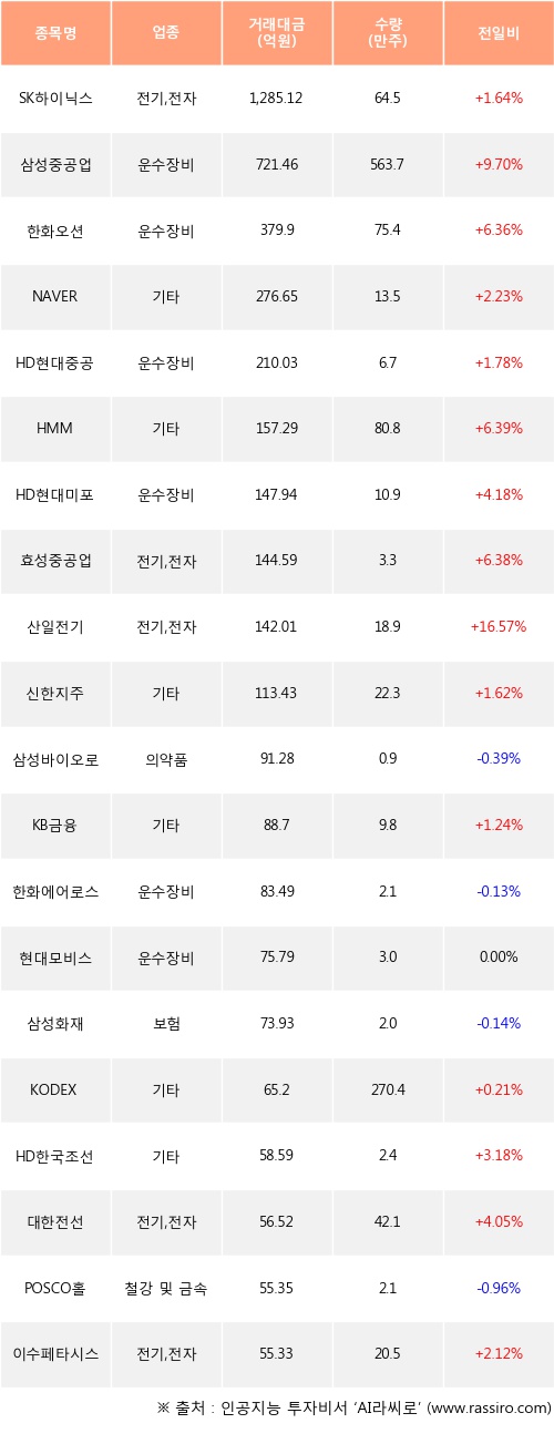 외국인 투자자의 순매수 상위 20개 종목은 SK하이닉스, 삼성중공업, 한화오션, NAVER, HD현대중공업, HMM, HD현대미포, 효성중공업, 산일전기, 신한지주등이다.